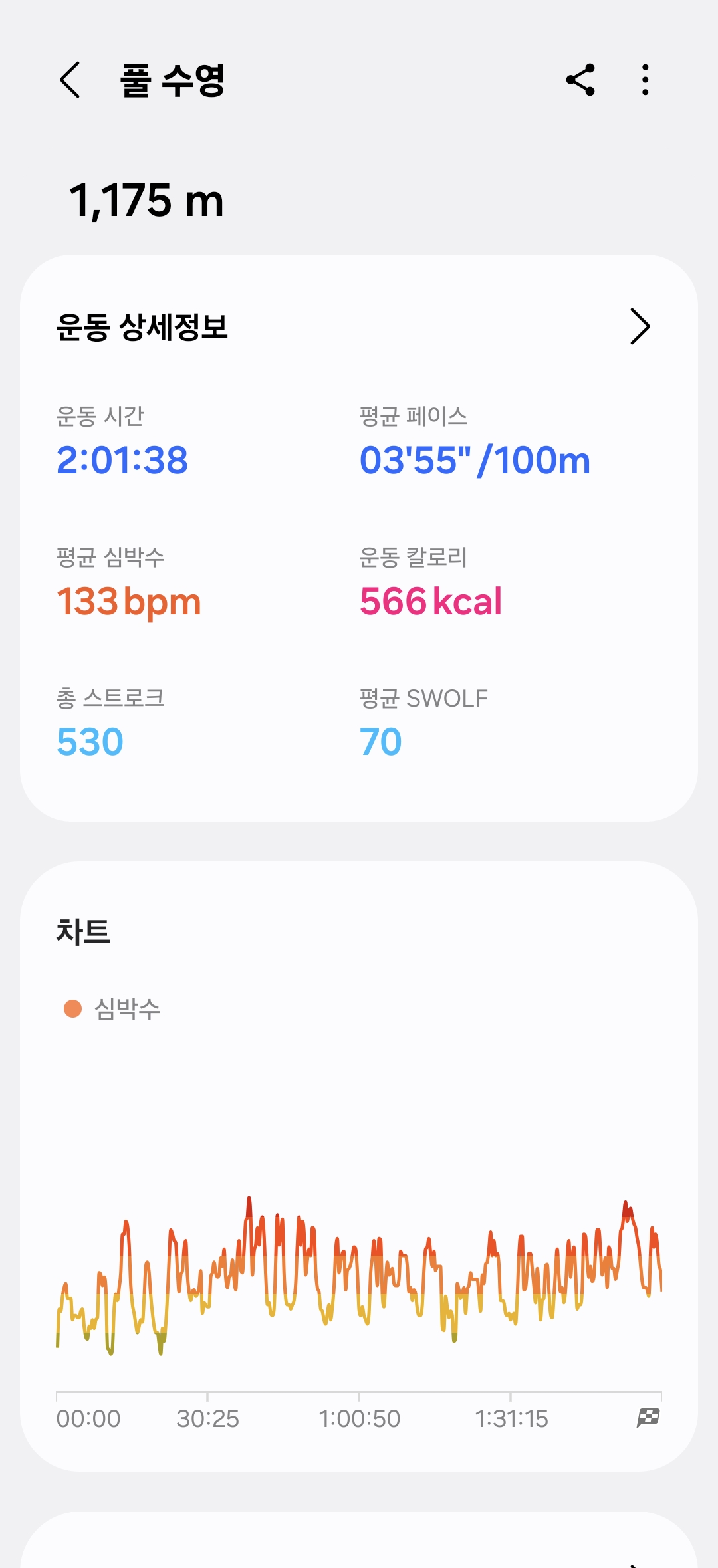 - SWOLF 📉: 초반 기록들은 100 언저리 숫자가 나왔는데, 요즘은 낮으면 60대까지도 나온다! (물론... 강습이나 자유수영 때 딴짓도 많이 하고 😇, 아직은 초급 레인에 주로 있다 보니 25m를 채우지 못하고 일어나야 하는 경우가 종종 있어서 데이터를 100% 신뢰할 수는 없지만...) 비슷하게 하고 있는데 점수가 낮아졌다는 건, 아무튼 늘고 있다는 것 아닐까!
